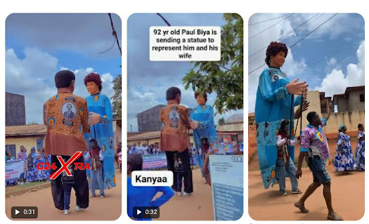The post took a dig at Cameroon’s 92-year-old President Paul Biya, who is running for re-election for an eighth term on October 12, 2025, with a video of supporters rallying using the giant statue, highlighting his long absence from the public eye despite recent appearances.