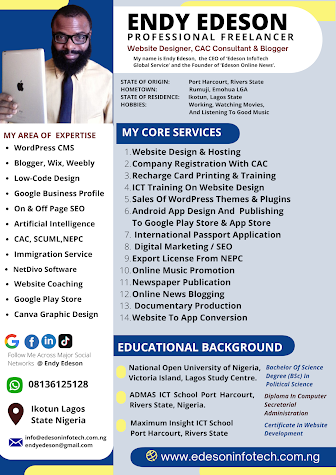 Endy Edeson is a Nigerian Blogger, Ebook Author, Businessman, Website Designer, ICT Lecturer, Digital Marketer, Freelancer, Google Play Store Android App Publisher, Corporate Affairs Commission Company Registration Consultant and International Passport Application Consultant.