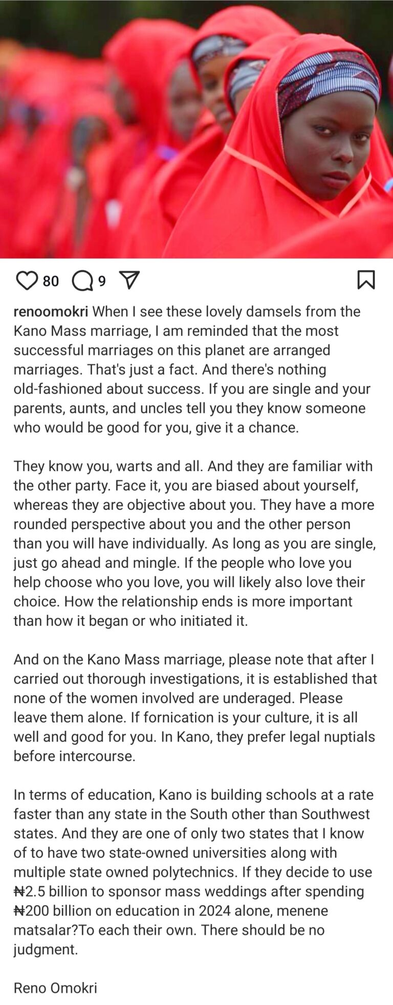Reno Omokri defended the Kano State Government budget for organizing large-scale weddings in the state.