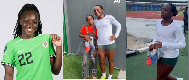 A touching video has captured the touching moment Super Falcons defender Michelle Alozi handed her football boots to a young fan in Abeokuta before Nigeria’s match against Benin Republic.
