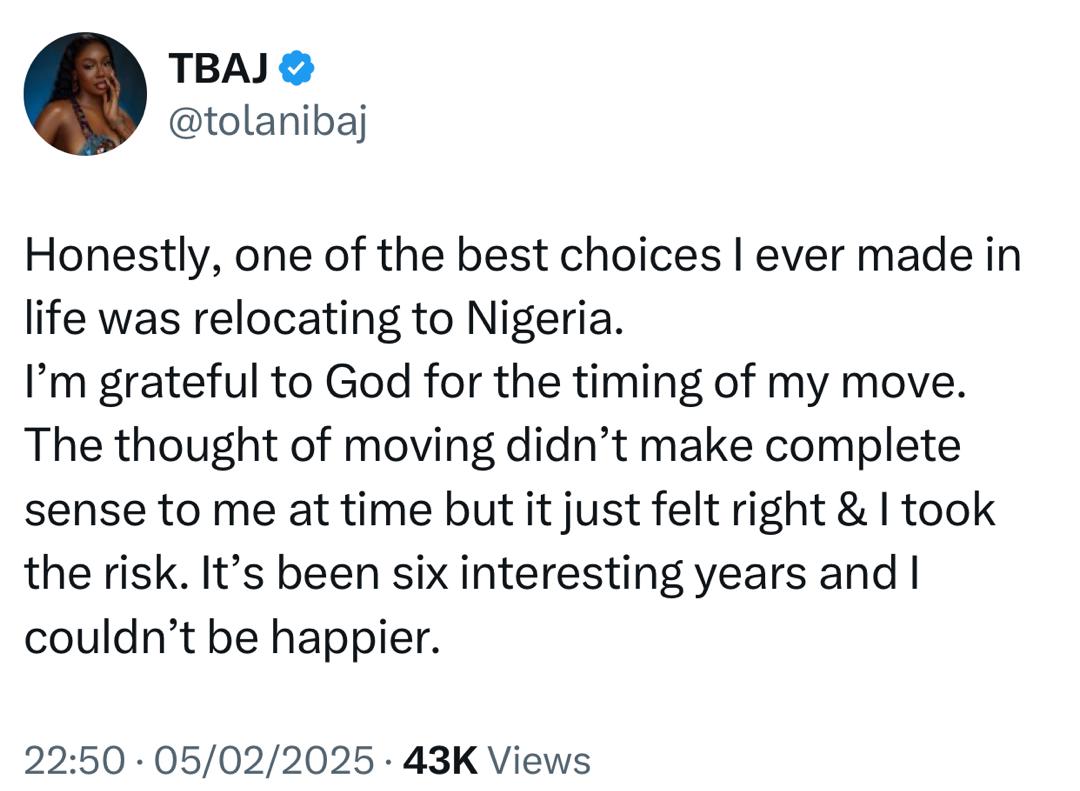 Big brother Naija star Tolanibaj said one of the best choices she made in her life was to move from the UK to Nigeria.