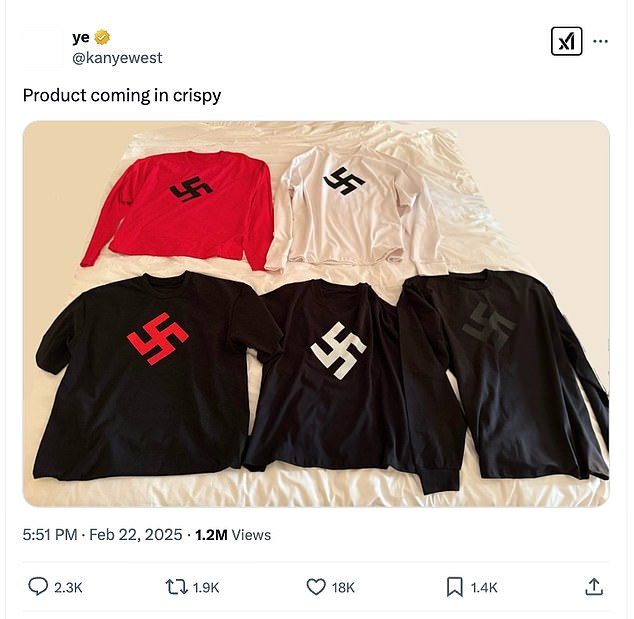 It was after the rapper’s shock of another post, showing off a new set of shirts and logos and putting Swastikas on his 33.3 million followers on the platform.