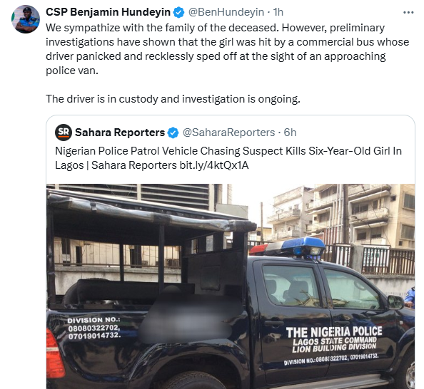 “We sympathize with the families of the deceased. However, preliminary investigations show that the girl was hit by a commercial bus and her driver was panicked when she saw an approaching police car.